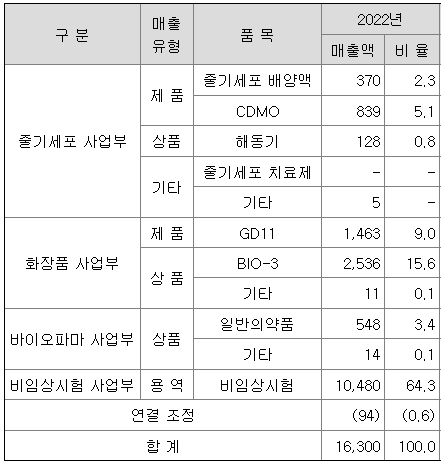 당사는 2010년에 설립된 줄기세포 치료제 개발 및 제조회사로 당사 및 종속회사의 사업부문은 크게 줄기세포 사업, 화장품 사업, 비임상 사업으로 나눌 수 있습니다.