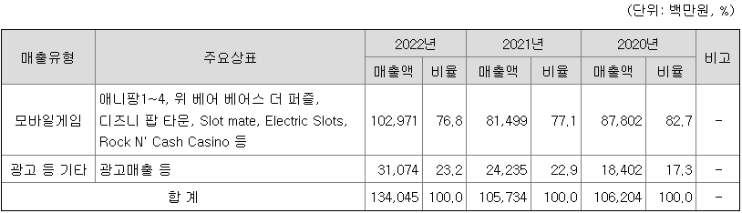 당사는 게임 소프트웨어 개발 및 공급업 등을 목적사업으로 하고 있으며, 주로 모바일 게임을 개발하여 서비스하고 있습니다. 주요 모바일 게임으로는 2012년 애니팡을 시작으로, 2013년 애니팡 사천성, 2014년 애니팡2, 아쿠아스토리, 2015년 상하이 애니팡, 애니팡 맞고, 2016년 애니팡 포커, 애니팡3, 애니팡 터치, 2017년 애니팡 섯다, 스누피 틀린그림찾기, 2018년 위 베어 베어스 더 퍼즐, 슬롯메이트, 2019년 디즈니 팝 타운, 2020년 애니팡4, 파워퍼프걸 스매쉬, 2021년 BT21 팝스타, 니모의 오션라이프, 2022년 슬롯메이트 앱 버전을 글로벌과 아시아 지역에 출시하고, 니모의 아쿠아팝을 아시아 지역에 출시했습니다.