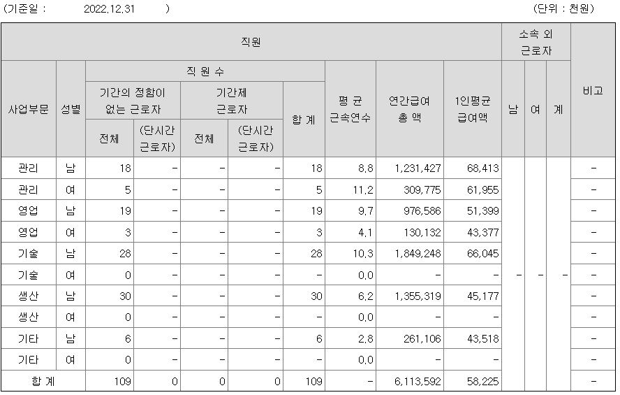 전체 평균연봉은 5822만원이고 직원수는 109명입니다.