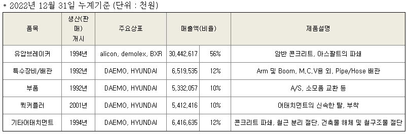 당사는 1987년 설립 후 1989년 법인으로 전환하였으며, 설립 후 신고서 제출일 현재까지 34년간 굴삭기 어태치먼트(부착물)인 유압브레이커, 퀵커플러 등을 제조하여세계 80여개국으로 판매하여 왔으며, 향후 2030년 특수목적 건설기계 종합 Maker가되는 것을 목표로 하는 건설기계 종합 전문 제조/판매사입니다.