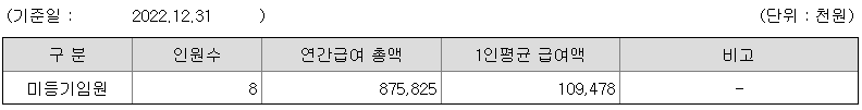 미등기임원의 평균연봉은 1억 947만원이고 직원수는 8명입니다.