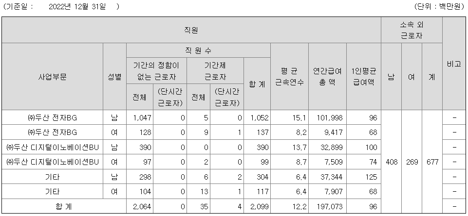 두산 연봉 2022년 기준 공시자료