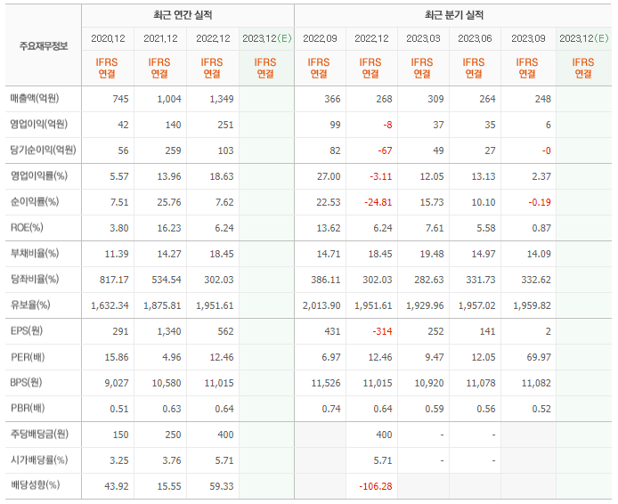 2022년 매출은 1349억, 영업이익은 251억, 당기순이익은 103억입니다. 그리고 영업이익률은 18.63%입니다.