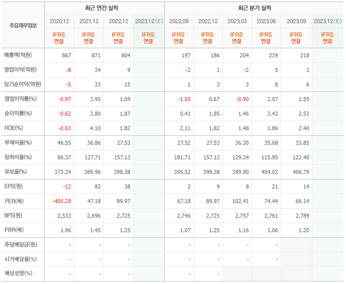 2022년 매출은 804억, 영업이익은 9억, 당기순이익은 15억입니다. 그리고 영업이익률은 1.09%입니다.