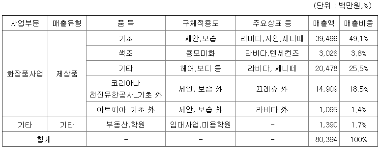 당사는 화장품 제조 및 판매를 주 사업으로 영위하고 있으며, 당사의 송파기술연구소에서 개발한 성과를 바탕으로 라비다, 자인, 녹두, 세니떼, 비취가인, 앰플엔, 프리엔제, 엔시아, 텐세컨즈 등의 브랜드를 보유하고 있습니다. 그 밖의 피부관리 노하우를 바탕으로 세레니끄(피부관리샵)를 가맹으로 운영하고 있으며, 유통망을 통한 건강식품 등을 판매하고 있습니다. 최근 당사의 사업부문은 화장품 사업부문과 기타(피부관리샵, 임대수입 外)로 구분하고 있으며 연결종속회사인 코리아나천진유한공사, (주)아트피아는 화장품사업부문으로 구분하고 있습니다.