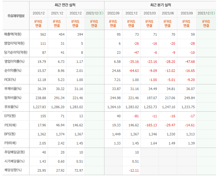 2022년 매출은 394억, 영업이익은 5억, 당기순이익은 8억입니다. 그리고 영업이익률은 1.17%입니다.