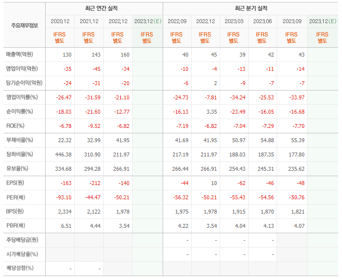 2022년 매출은 160억, 영업이익은 -34억, 당기순이익은 -20억입니다. 그리고 영업이익률은 -21.10%입니다.
