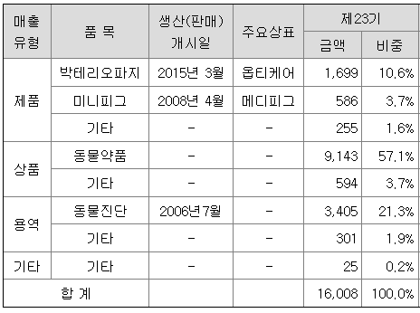당사의 동물 약품 부문은 동물 약품 공급업체 중 유일하게 약품의 효능검정, 동물실험, 질병진단, 연구기관이 있는 업체이며, 목적 동물에 대한 동물 약품의 효능검사, 함량검사, 항생제 내성검사 등의 확보된 데이터를 통하여 효능이 입증된 동물 약품을 공급할 수 있어 일반적인 동물 약품을 공급하는 업체에 비해 장점을 가지고 있습니다.