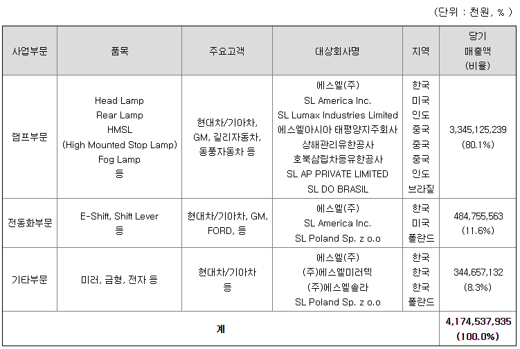 지배기업인 당사와 11개의 종속회사는 자동차 부품 전문기업으로 자동차 램프, 전동화 부품, 미러, 전자 등의 제품을 생산하여 국내외의 현대차, 기아차, GM, Ford, Geely 등의 OEM에 납품하고 있습니다.