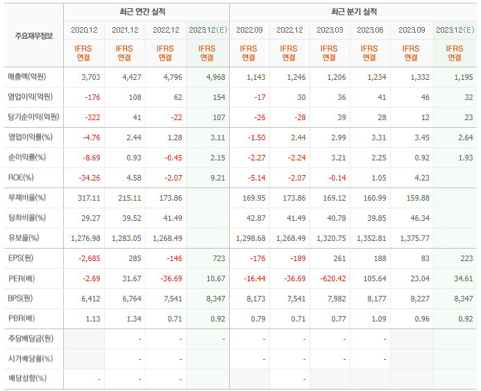 2022년 매출은 4796억, 영업이익은 62억, 당기순이익은 -22억입니다. 그리고 영업이익률은 1.28%입니다.