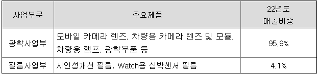 회사와 그 종속기업(이하 '연결회사')은 광학부품 전문기업으로 모바일 카메라렌즈, 차량용 카메라 렌즈 및 모듈, 차량용 램프, 광학부품, 광학필름 등의 사업 영역에서 관련 부품을 제조, 판매하고 있습니다. 국내ㆍ외 7개 생산기반을 갖추고 있으며 국내4개의 연구소(모바일, 자동차, 금형, 필름)를 운영하며 고객사 기술개발에 발맞추어 지속적인 기술개발을 이어가고 있습니다. 국내 사업장으로는 동두천(모바일 카메라렌즈), 평택(차량용 카메라 모듈), 아산(광학필름), SAL(차량용 램프)에 제조 시설을 갖추고 있습니다. 해외 사업장으로는 중국(모바일 카메라 렌즈, 차량용 카메라 렌즈),베트남(모바일 카메라 렌즈, 차량용 카메라 모듈), 폴란드(차량용 램프)에 3개 생산법인을 운영하고 있습니다. 연결회사는 상기 사업장에 대해서 2개의 사업부문으로 구분하고 있습니다. 광학사업부문(모바일, 자동차, 램프, 광학부품)과 필름사업부문(시인성개선 필름, 심박센서 필름)으로 운영되고 있습니다.