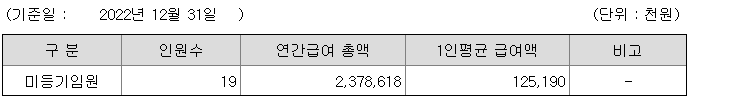 미등기임원의 평균연봉은 1억 2519만원이고 직원수는 19명입니다.
