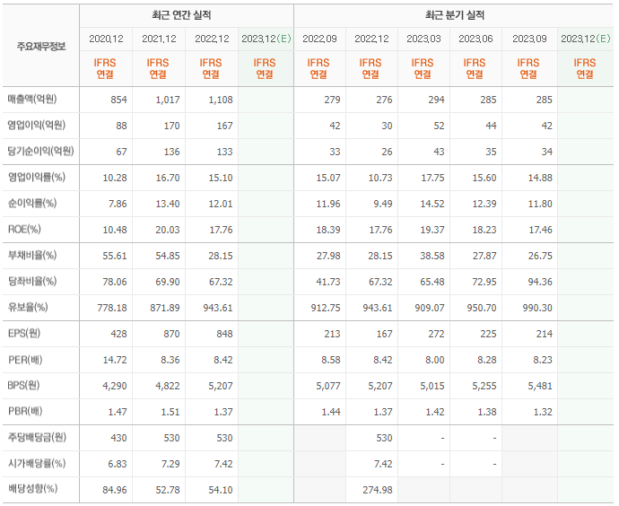2022년 매출은 1108억, 영업이익은 167억, 당기순이익은 133억입니다. 그리고 영업이익률은 15.10%입니다.