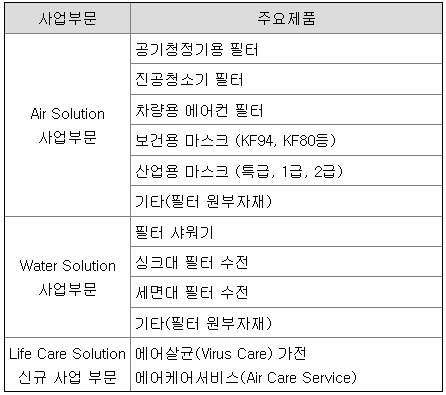 MB 필터 기술을 활용해 보건용 및 산업용 마스크 뿐만 아니라 공기청정기용필터, 진공청소기용필터, 차량용 에어컨 필터를 생산 판매하는 에어솔루션 사업부문과 필터 샤워기와 수전 필터를 생산 판매하는 워터솔루션 사업부문, B2C 포트폴리오 확대를 위한 라이프케어 신규 사업부문으로 총 3개 사업부문으로 구성되어 있습니다.