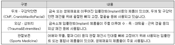 - 당사에서 생산 및 판매하는 제품(의료기기)은 인체에 근간을 이루는 206개의 뼈중 척추 및 고관절등 일부 뼈를 제외한 대부분의 뼈의 접합(Fixation), 대체(Replacement) 및 조정(Adjustment)을 목적으로 사용되며, 이러한 치료 목적이나 부위에 따라 금속소재(스테인레스스틸 및 티타늄) 또는 생체재료(Peek, Biocomposite)로 된 제품을 이용합니다.