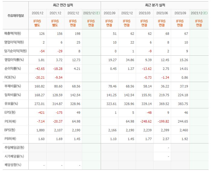 2022년 매출은 198억, 영업이익은 25억, 당기순이익은 8억입니다. 그리고 영업이익률은 12.73%입니다.