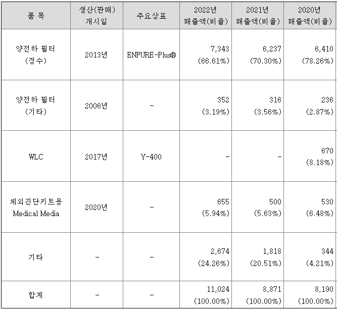 당사는 『습식(Wet-Laid) 제조공정에 기반을 둔 첨단부직포 제조기술』을 기반으로, 『양전하 고성능 정수용 나노필터』, 『체외진단키트용 Medical Media』 등과 같은 다양한 복합소재와 연결종속회사인 ㈜세프라텍을 통해 분리막, 막모듈, 막제조설비 등의 제품을 개발, 생산 및 판매를 하고 있습니다.