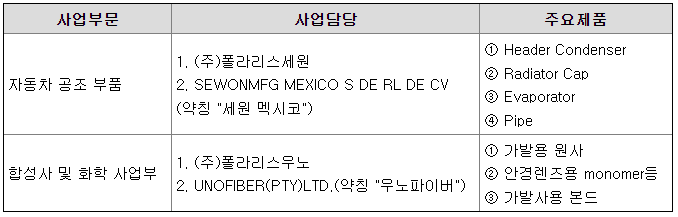 연결회사는 자동차용 공조 부품, 합성사사업부, 화학사업부 총 3개 사업부 체제로 운영되고 있습니다. 이중 자동차 공조부품은 (주)폴라리스세원 및 세원 멕시코법인에서 합성사 및 화학사업부는 (주)폴라리스우노 및 우노파이버에서 별도 사업담당체제로 운영하고 있습니다. 각 사업부문별 주요 제품은 다음과 같습니다.