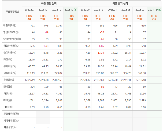 2022년 매출은 1767억, 영업이익은 86억, 당기순이익은 39억입니다. 그리고 영업이익률은 4.89%입니다.