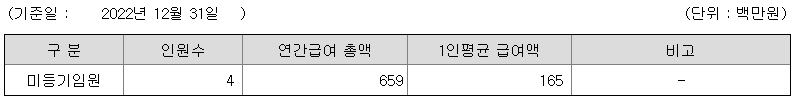 미등기임원의 평균연봉은 1억 6500만원이고 직원수는 4명입니다.