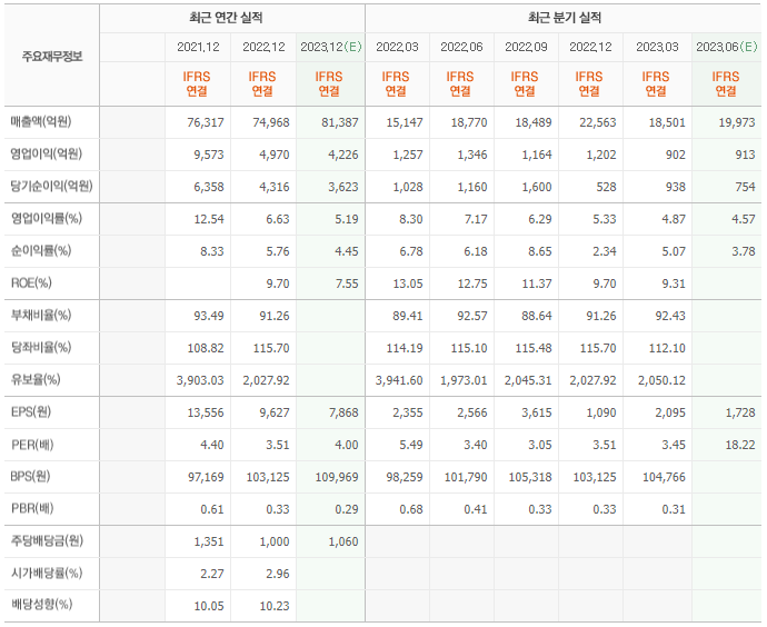 2022년 실적은 7조 4968억, 영업이익은 4970억입니다. 그리고 영업이익률은 6.40%입니다.