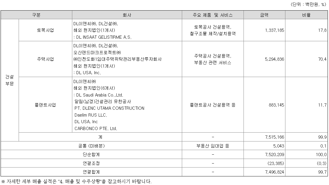 국내 주택, 토목사업을 영위하는 DL건설㈜, 사업부지 개발 및 아파트 신축, 분양(디벨로퍼) 사업을 수행하는 PFV인 오산랜드마크프로젝트㈜, 부동산 개발 사업을 수행하는 ㈜인천도화1임대주택위탁관리부동산투자회사, 해외 건설공사를 수행하기 위해 설립된 해외 현지 법인(DL Saudi Arabia Co., Ltd., PT. DLENC UTAMA CONSTRUCTION, 달림(남경)건설관리 유한공사, DL USA, Inc., DL INSAAT GELISTIRME A.S., Daelim RUS LLC.) 그리고 친환경 탈탄소 사업을 영위하는 CARBONCO PTE. LTD. 가 있습니다.