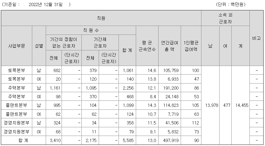 | 사업부문 | 성별 | 직원수 | 평균근속연수 | 평균연봉(백만) |