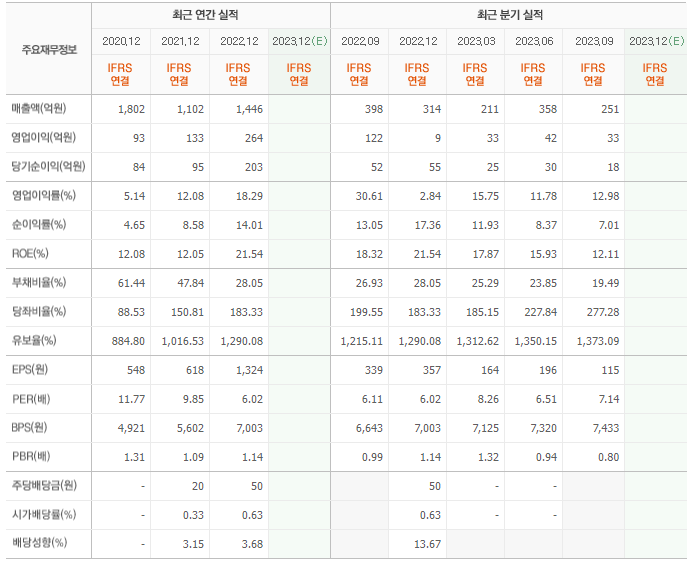 2022년 매출은 1446억, 영업이익은 264억, 당기순이익은 203억입니다. 그리고 영업이익률은 18.29%입니다.
