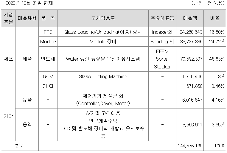 가. FPD 및 반도체 생산장비에 관한 물류제어 기술을 이용하여 FPD (Indexer), Wafer Cassette Station (EFEM), 디스플레이 Module장비 등을 개발, 생산, 판매하고 있습니다.