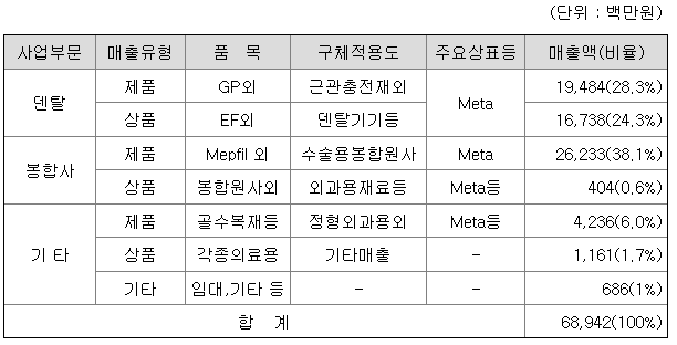 당사는 치과용재료 및 기기, 생분해성 봉합원사, 미용성형용 원사 및 관련상품, 정형외과 및 치과용골수복재, 의료기기 제품을 연구, 개발, 생산하여 판매하고 있습니다.
