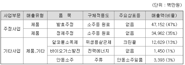 당사는 주로 소주의 원료로 사용되는 발효주정과 정제주정을 생산, 판매하고 있으며 부수적으로 주정소비 촉진을 위한 알코올소독제(크린콜 등) 생산, 판매 및 바이오가스발전사업을 영위하고 있습니다.
