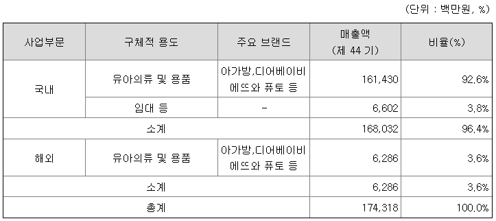 당사의 사업부문은 국내부문과 해외부문으로 구별됩니다. 국내부문은 (주)아가방앤컴퍼니의 내수부문과 (주)아펙스, (주)디자인스킨이며, 해외부문은 (주)아가방앤컴퍼니의 해외부문과 AGABANG U.S.A., 연태아가방복식유한공사, 북경아가방무역유한공사로 구분하였습니다.