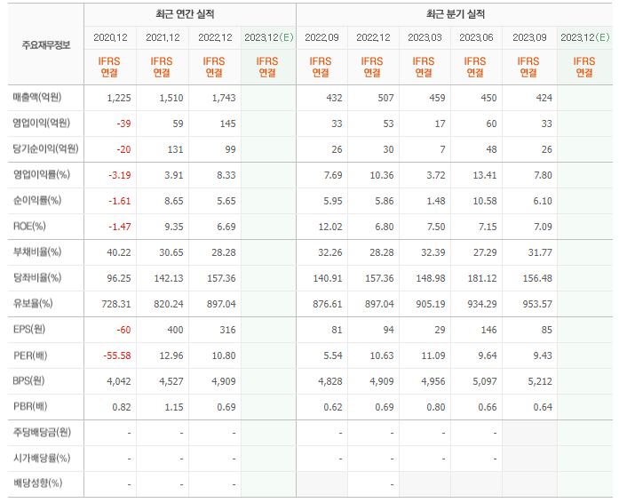2022년 매출은 1743억, 영업이익은 145억, 당기순이익은 99억입니다. 그리고 영업이익률은 8.33%입니다.