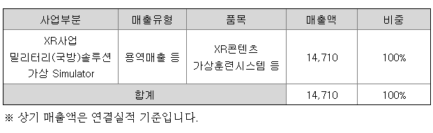 당사는 VR(가상현실), AR(증강현실) 등의 XR 콘텐츠 및 메타버스 플랫폼 개발과 종합군수지원(ILS), 가상훈련시스템, 시뮬레이터 등의 밀리터리(국방) 솔루션 개발을 주요사업으로 하고 있습니다.