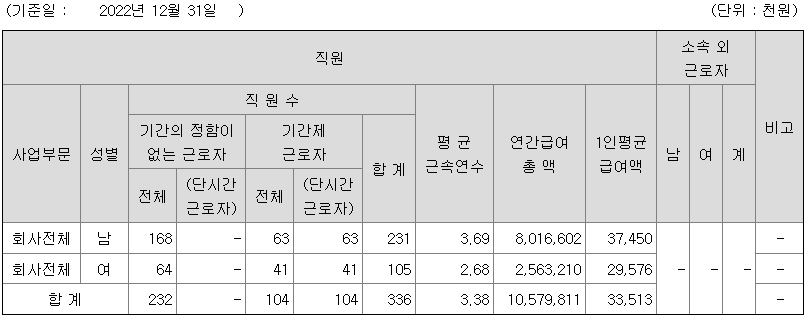 남성의 평균연봉은 3745만원이고 직원수는 231명, 여성은 2957만원이고 직원수는 105명입니다. 전체 평균연봉은 3351만원이고 직원수는 336명입니다.