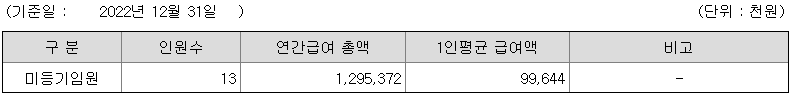 미등기임원의 평균연봉은 9964만원이고 직원수는 13명입니다.