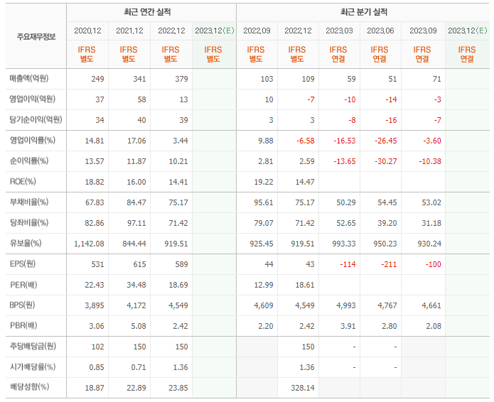 2022년 매출은 379억, 영업이익은 13억, 당기순이익은 39억입니다. 그리고 영업이익률은 3.44%입니다.