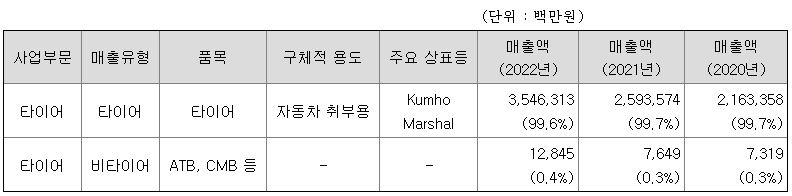당사의 당기말 타이어 매출은 3,546,313 백만원(전체 매출의 99.6%)이며, 비타이어 매출(ATB, CMB 등)은 12,845백만원 (전체 매출의 0.4%) 입니다.