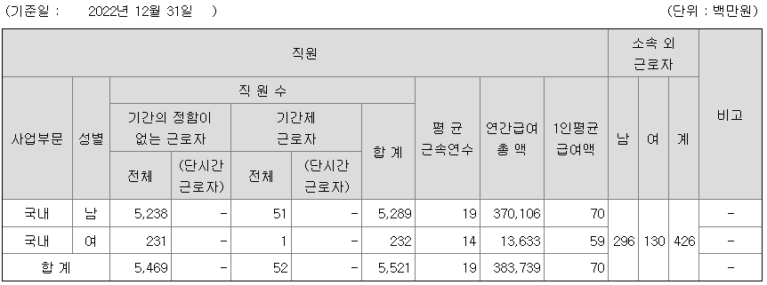 | 사업부문 | 성별 | 직원수 | 평균근속연수 | 평균연봉(백만) |