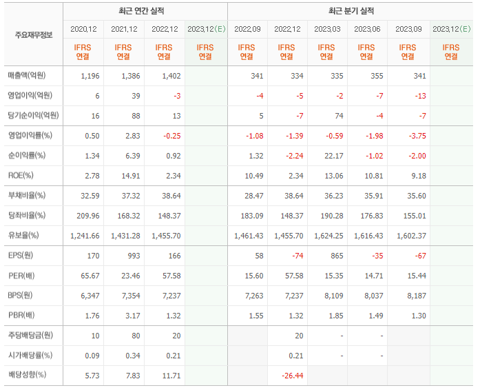 2022년 매출은 1402억, 영업이익은 -3억, 당기순이익은 13억입니다. 그리고 영업이익률은 -0.25%입니다.