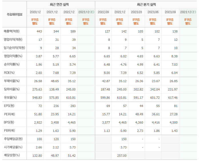 2022년 매출은 589억, 영업이익은 39억, 당기순이익은 34억입니다. 그리고 영업이익률은 6.65%입니다.