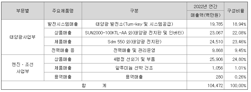 당사는 태양광 발전사업자와 시스템 공급업체를 대상으로 태양광 발전시스템 및 태양전지판, Inverter 등을 공급하는 태양광 사업부와 어민 및 레져 사업자 등을 대상으로 Outboard Motor(선외기)를 공급하는 엔진ㆍ조선 사업부로 나누어져 있습니다.