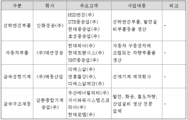 당사는 제조업을 주업으로 하는 회사로서 선박엔진부품과 자동차부품, 금속성형기계, 금속구조재등을 생산하는 사업을 영위하고 있으며 당사 및 종속회사의 사업부문별 현황을 요약하면 아래와 같습니다.