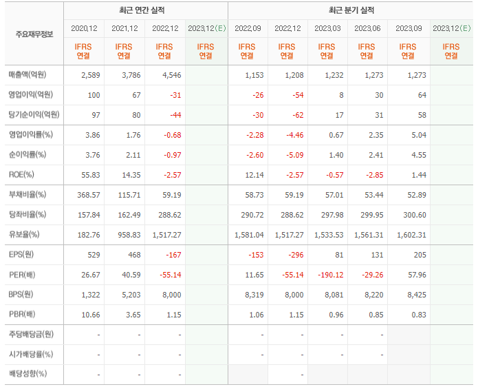 2022년 매출은 4546억, 영업이익은 -31억, 당기순이익은 -44억입니다. 그리고 영업이익률은 -0.68%입니다.