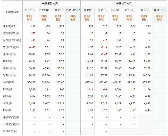 2022년 매출은 958억, 영업이익은 37억, 당기순이익은 84억입니다. 그리고 영업이익률은 3.83%입니다.