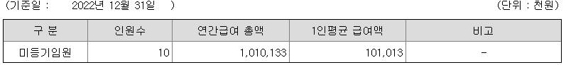 미등기임원의 평균연봉은 1억 101만원이고 직원수는 10명입니다.