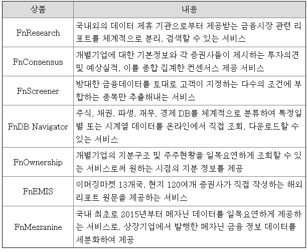 FnGuide.com은 금융시장의 방대한 데이터를 조회하고 다운로드 할 수 있는 웹사이트로 지속적으로 데이터의 양과 범위를 확대하고 있습니다. 웹을 통한 금융정보 제공 부문은 데이터의 중요성과 필요성에 대한 전반적 인식이 선진화됨에 따라 수요는 지속적으로 확대될 것으로 전망되며 다음의 하위상품으로 구성되어 있습니다.