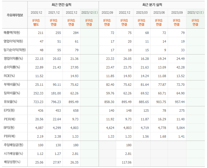 2022년 매출은 284억, 영업이익은 61억, 당기순이익은 79억입니다. 그리고 영업이익률은 21.36%입니다.