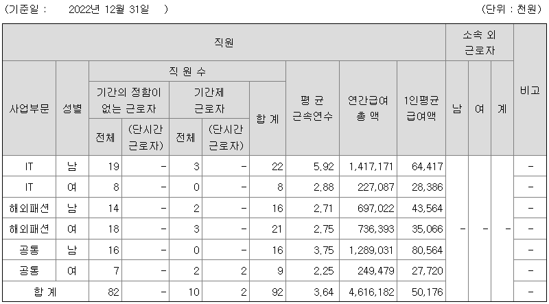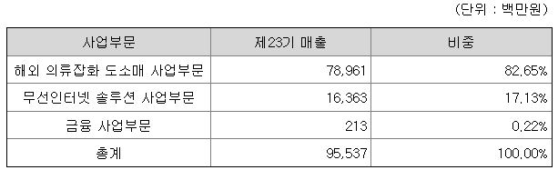 주력사업은 해외패션의류 사업부분영역으로 명품 병행수입을 기반으로한 패션전문기업입니다. 또한 메세징 커뮤니케이션, E-Commerce 플랫폼 구축, SI, 솔루션 개발등 IT서비스 사업을 영위하고 있습니다.