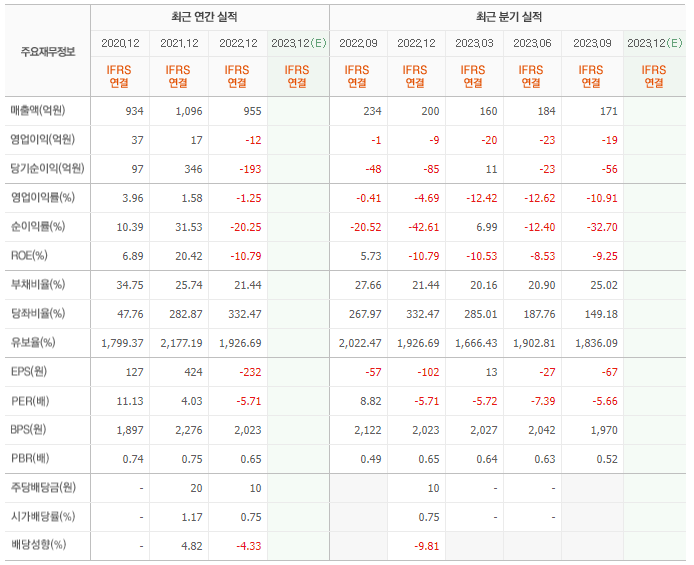 2022년 매출은 955억, 영업이익은 -12억, 당기순이익은 -193억입니다. 그리고 영업이익률은 -1.25%입니다.